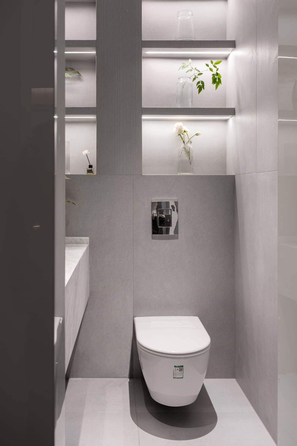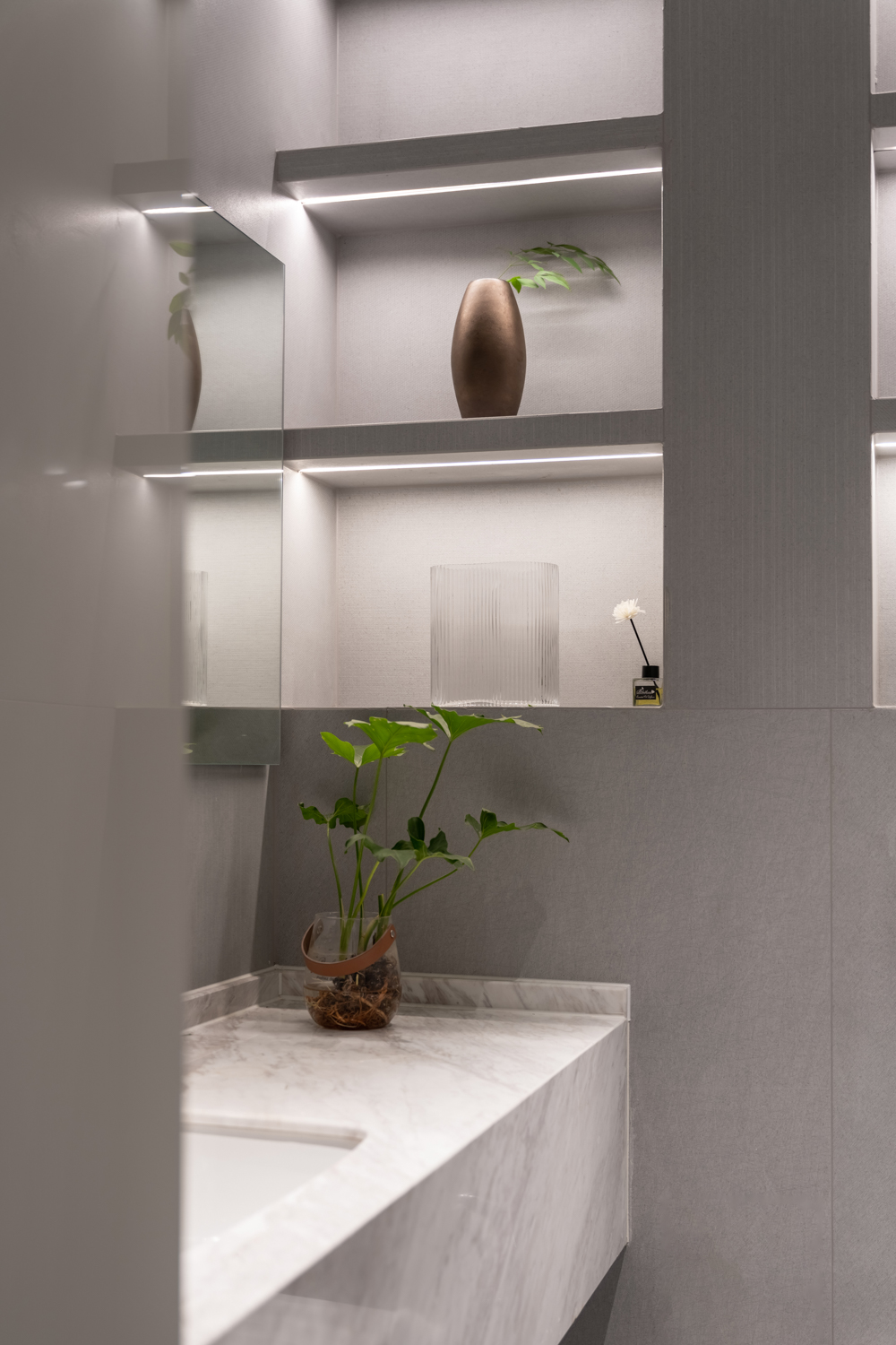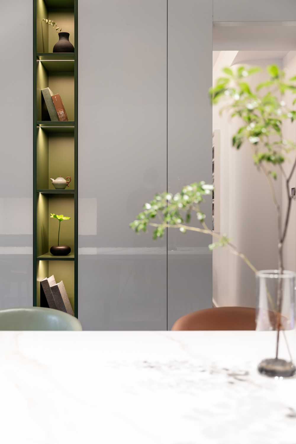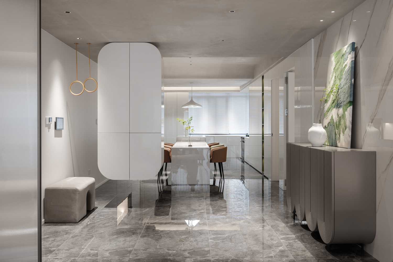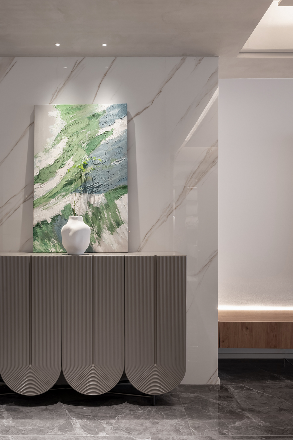 入戶兩側(cè)空間通而不通,展示性鞋柜,同時(shí)也有通透性,格局上做了分割,視覺上卻是半分割。