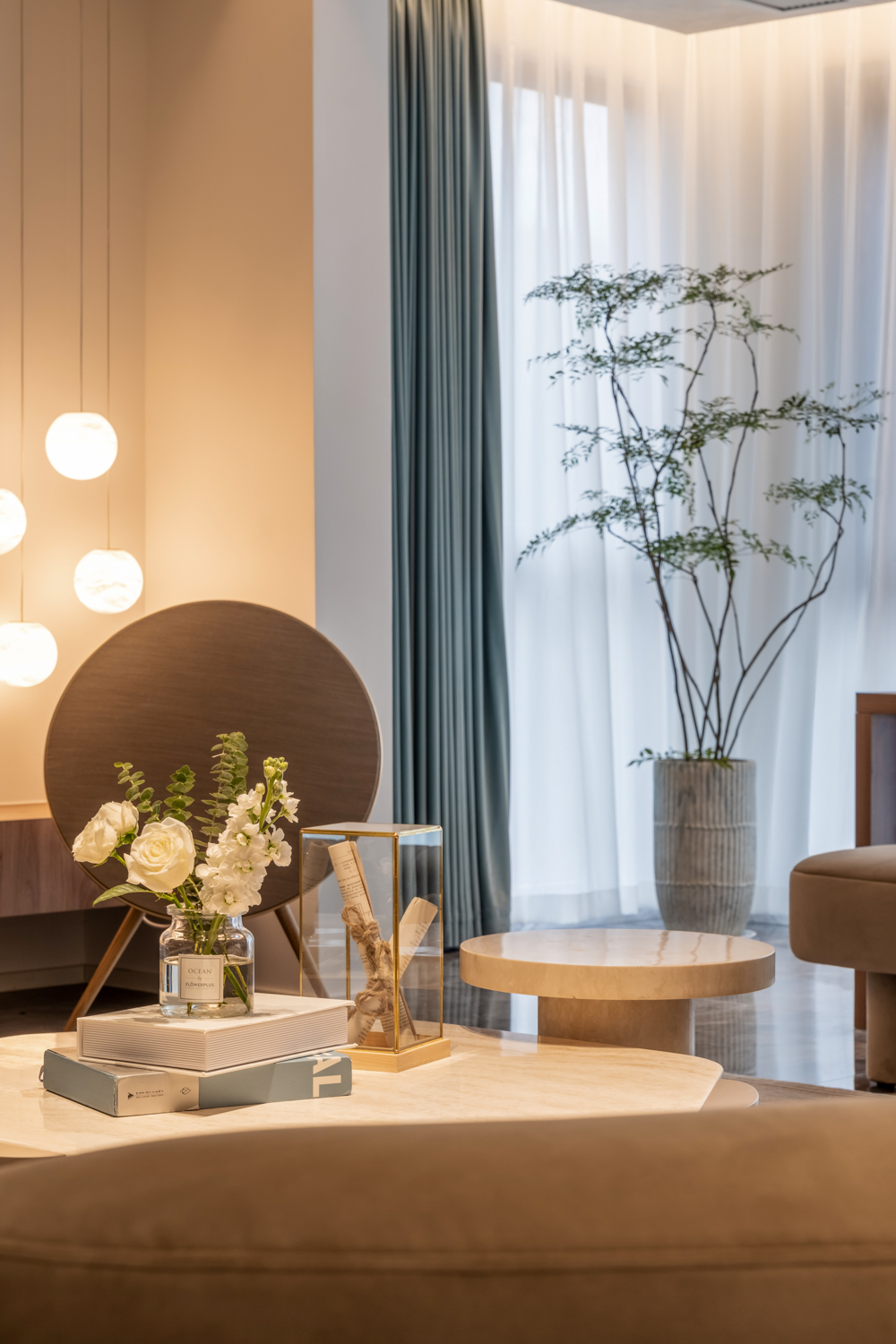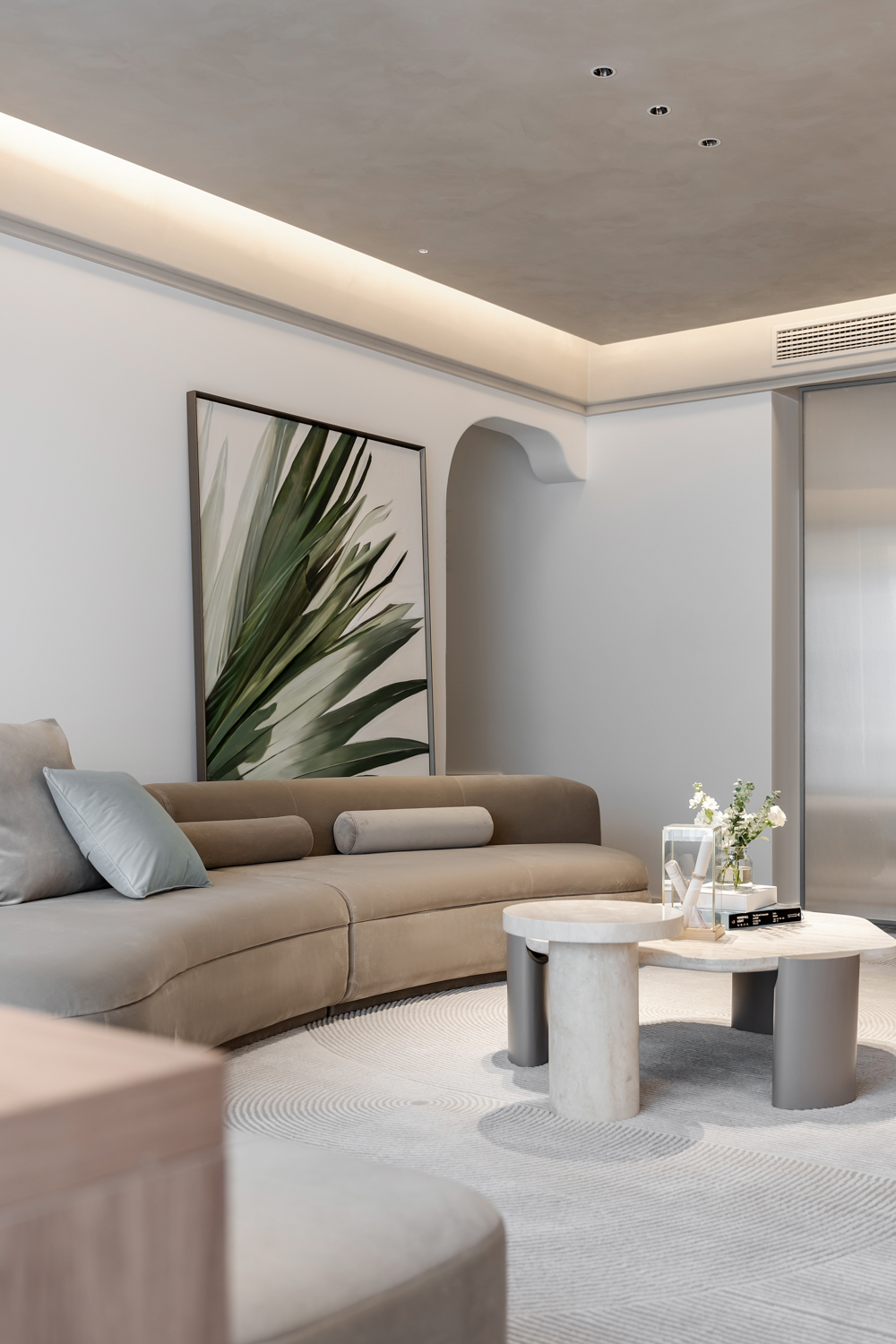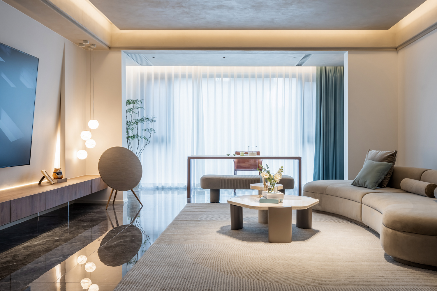 客廳,陽臺(tái)空間連接,以大客廳的形式呈現(xiàn),其中小細(xì)節(jié)里面帶一些詫寂的元素在里面。