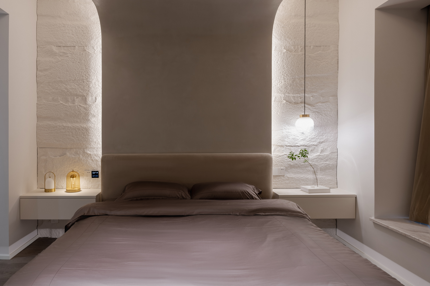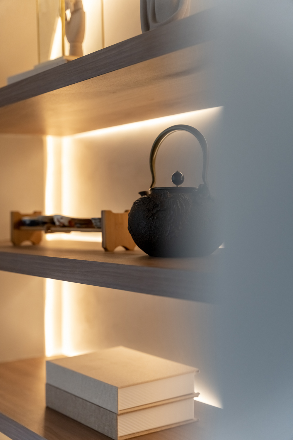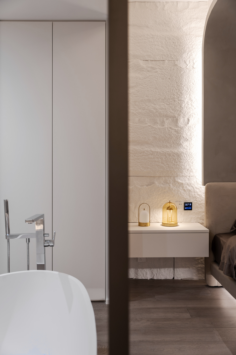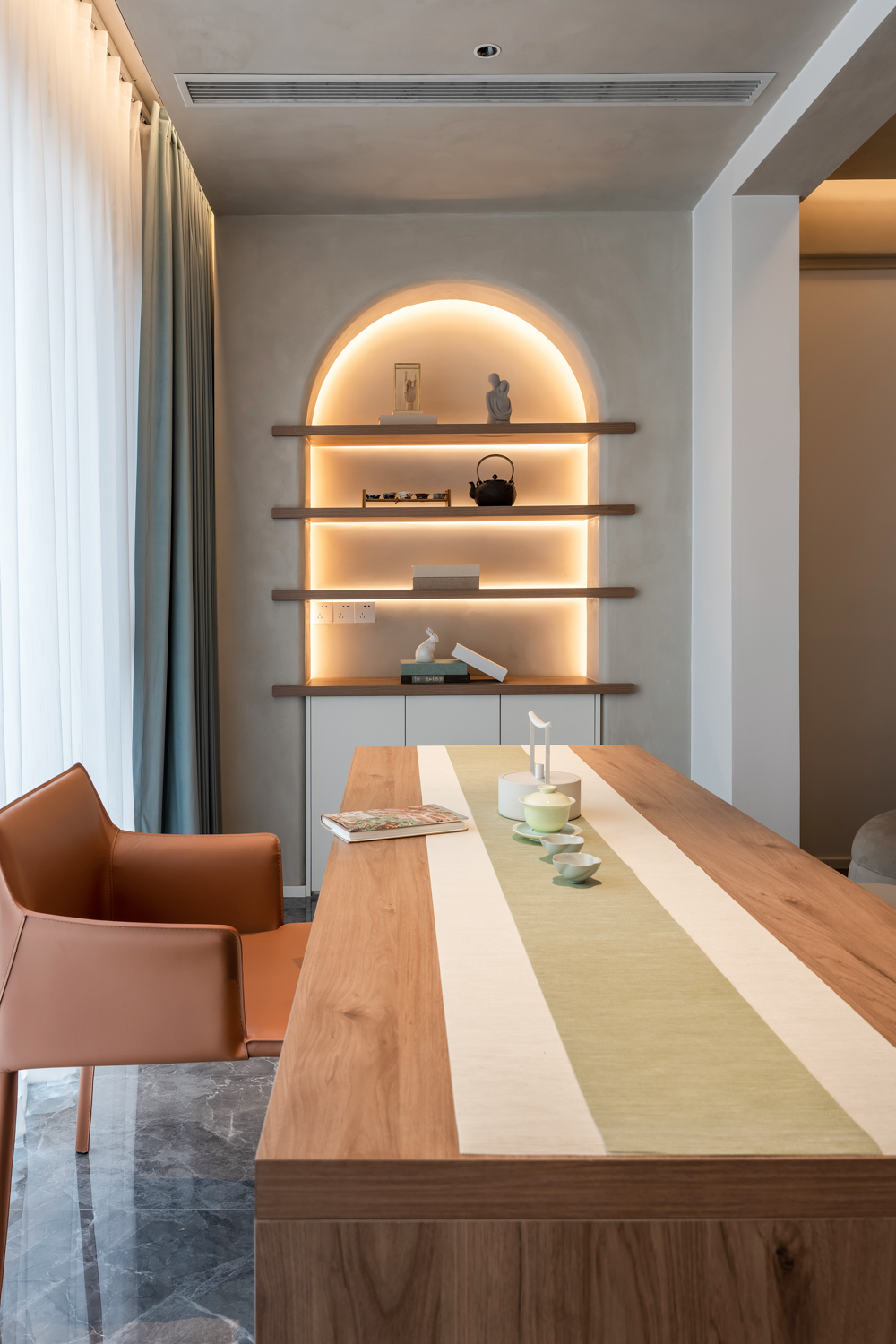 電視墻是做了一個(gè)很大的極簡壁爐的樣子,在入戶次臥的門洞以及陽臺(tái)的展示柜都采用的詫寂風(fēng)的舊造型。