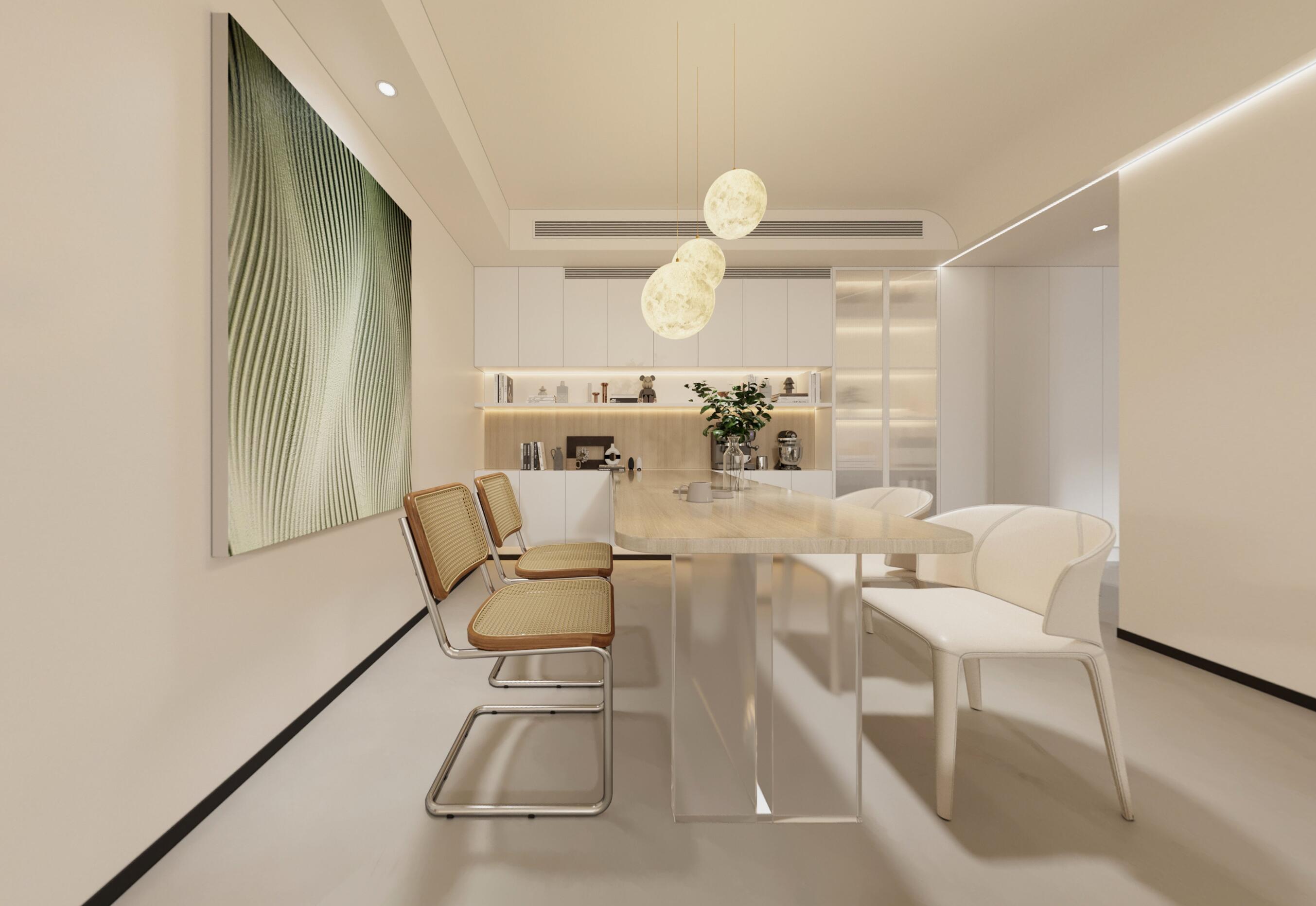 設(shè)計(jì)賞析: 極簡(jiǎn)風(fēng)格的客餐廳,不用多余的元素去描繪,客廳的斗膽燈與餐廳的吊燈簡(jiǎn)單而不失格調(diào),簡(jiǎn)單的幾張家具構(gòu)成了活動(dòng)的區(qū)域。