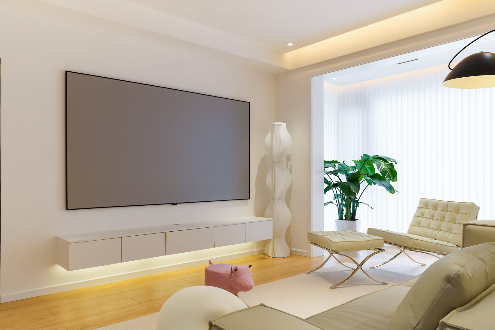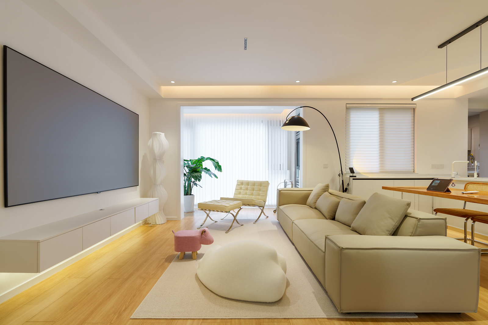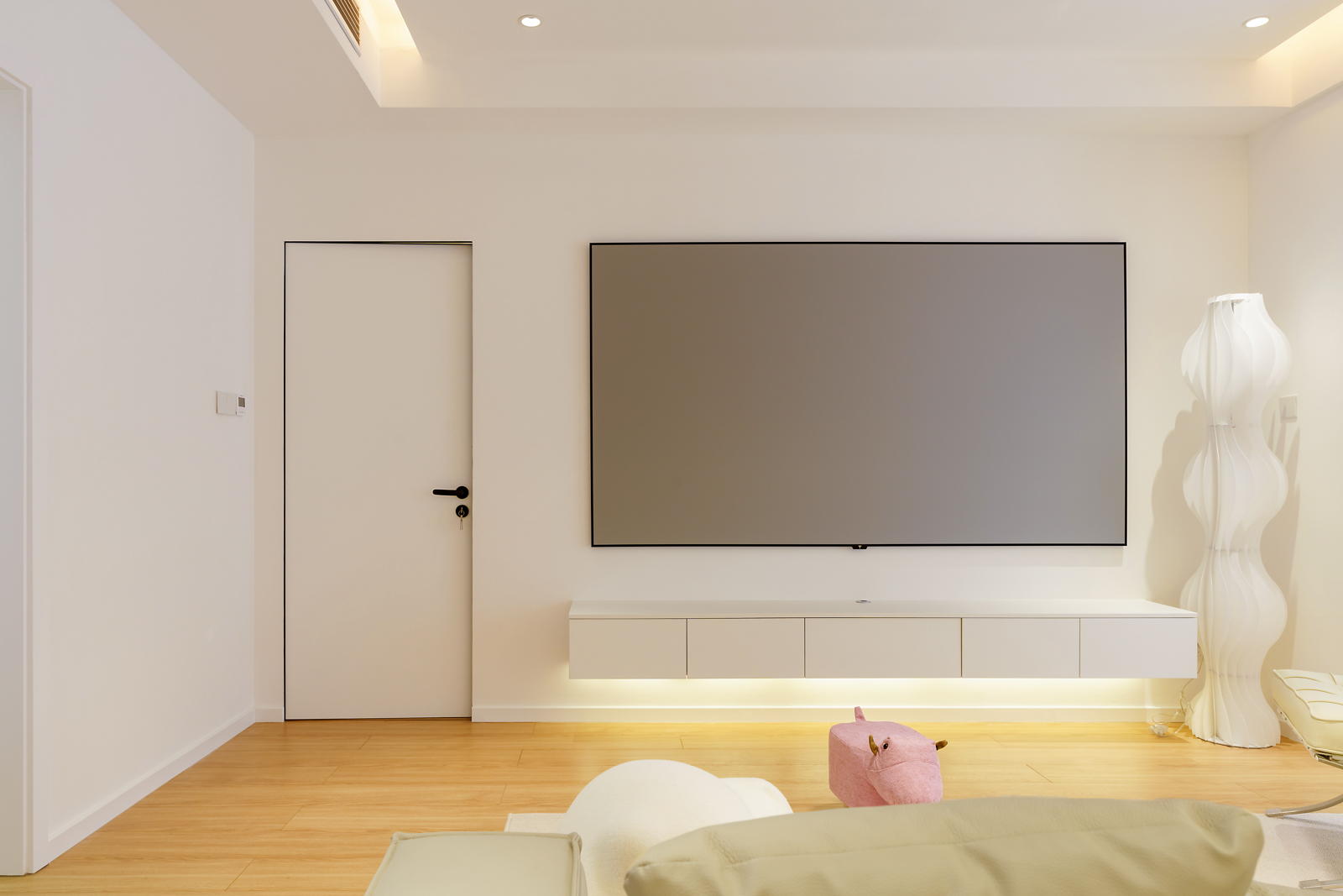 客廳背景墻,倘若不是主臥的門微微敞開,有提示性黑色把手,這扇隱形門就與背景墻融為一體,整體性極強,造型極簡自然不做任何多余設(shè)計,簡單舒適。大尺寸灰塑畫框幕布,大屏幕觀影的感覺不要太好。