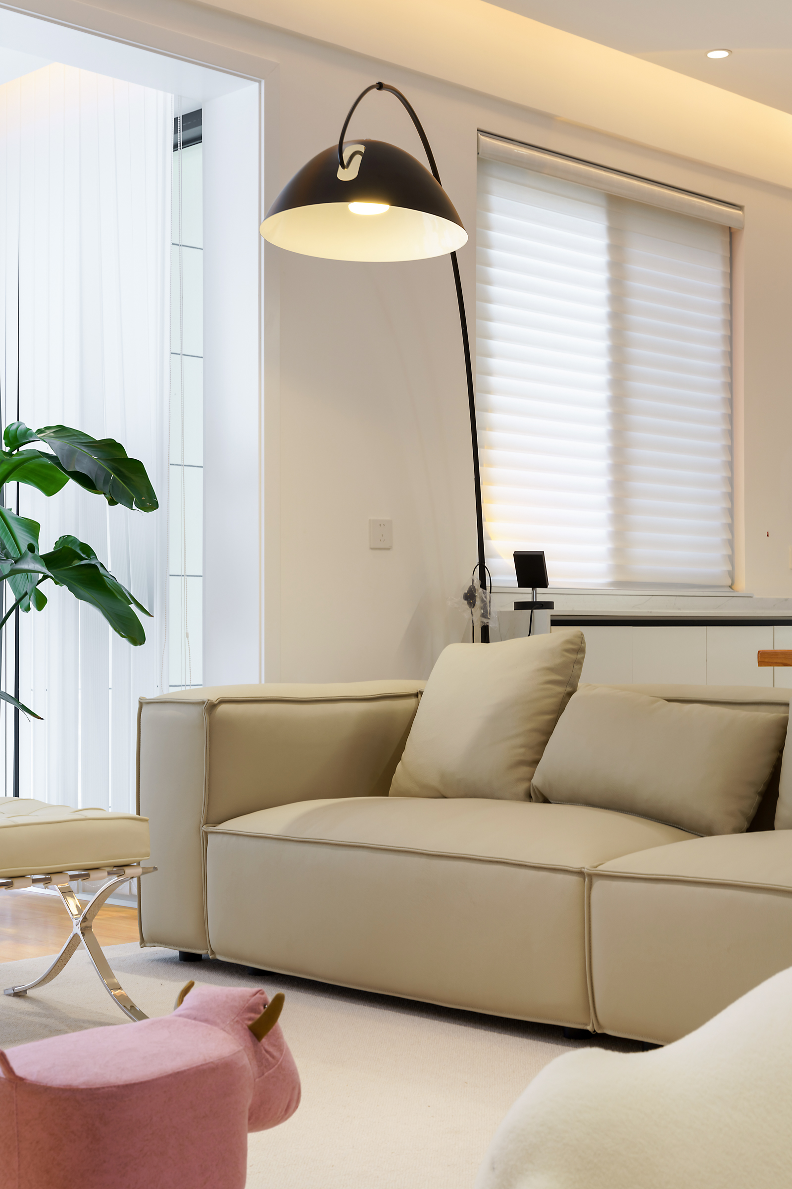 向右,與客廳相連的陽臺,少不了自然動人的綠植,在溫馨的家居里治愈生長。落座在簡潔淺咖色的沙發(fā)上,整個空間明亮,溫柔;特別的材質(zhì)紋理創(chuàng)造了平靜祥和以及放松的氛圍。