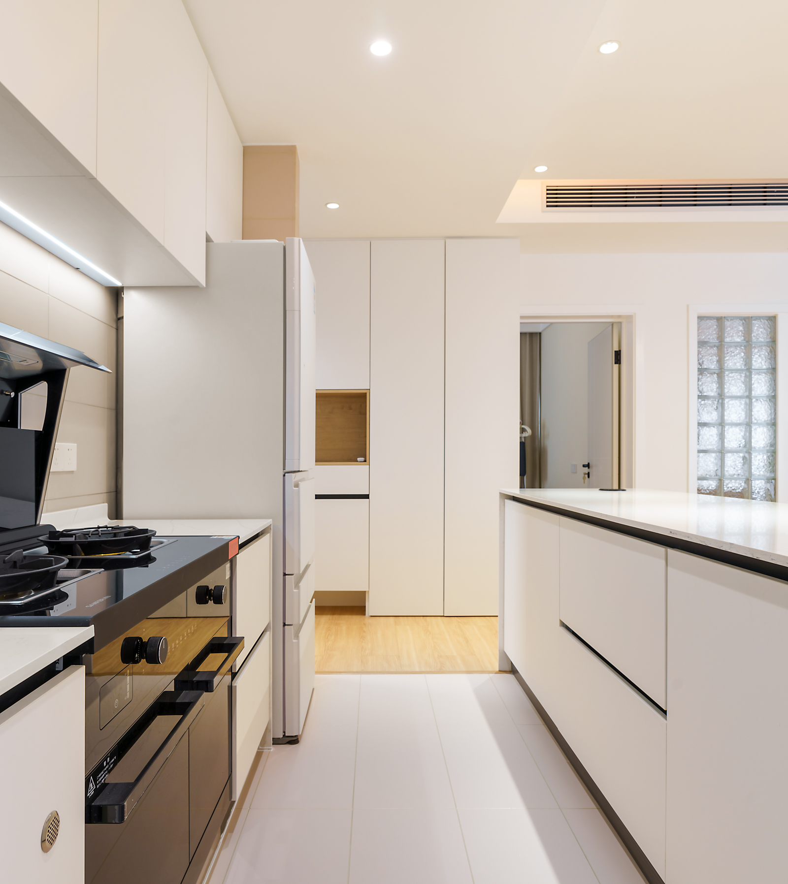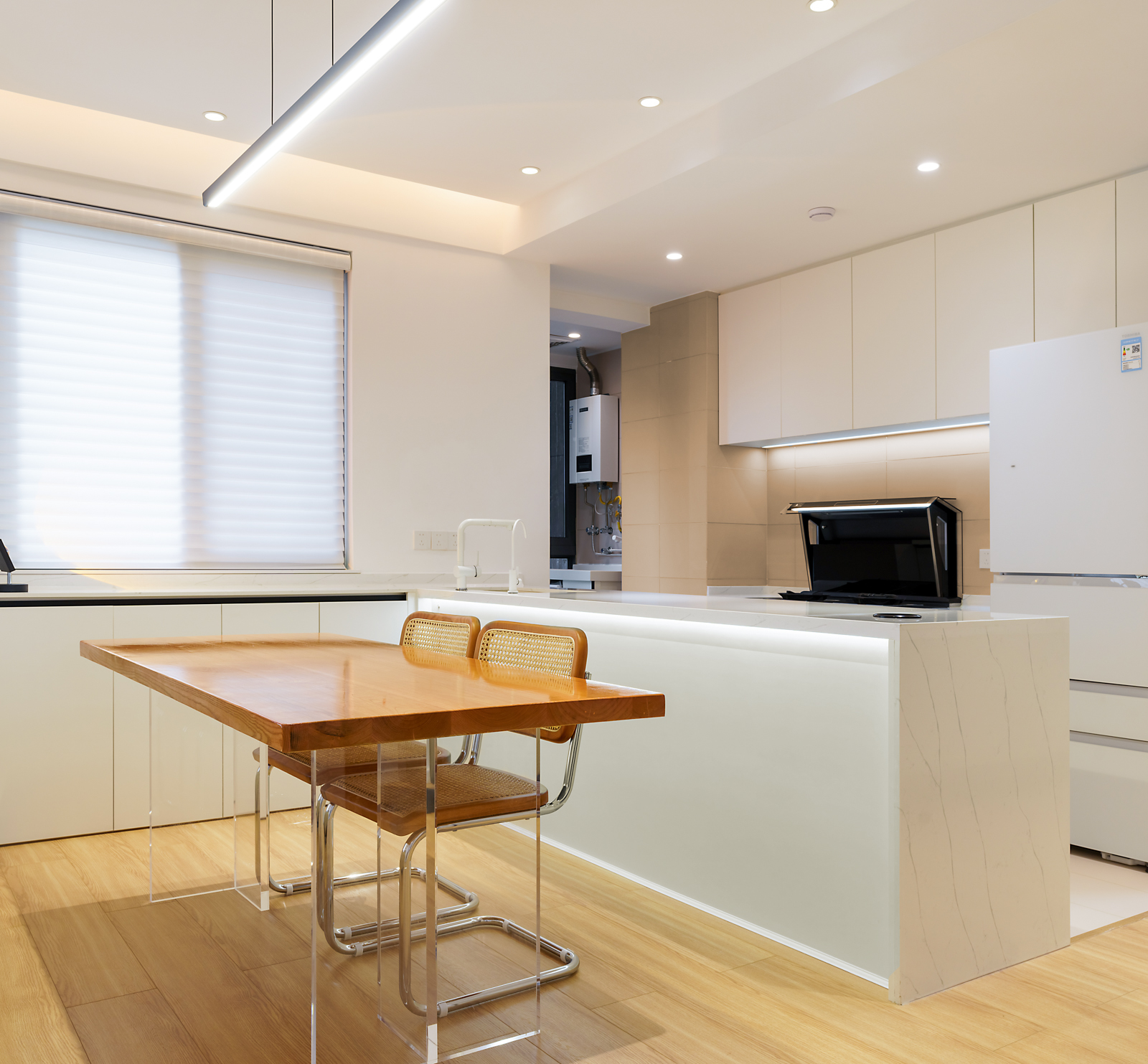 一整排吊柜,增加廚房收納空間和臺面使用空間,簡潔明快的大單盆洗水槽比雙槽更寬敞實用,可以洗大鍋,洗菜,水流不會四溢,空間靈活感更強。