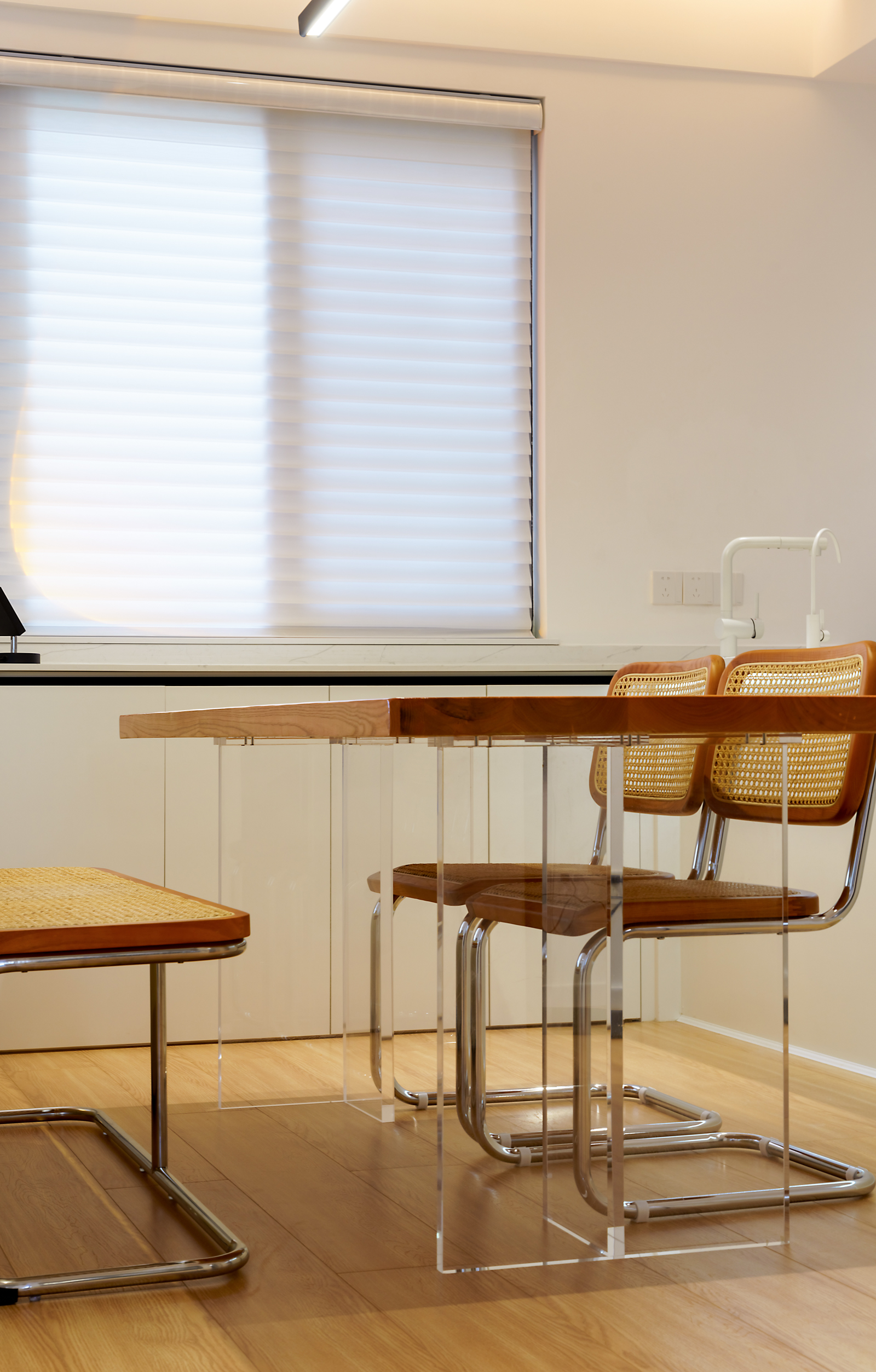 熱氣騰騰的飯菜,轉(zhuǎn)身即可端上餐桌。與大客廳相連,通透又不失簡約和優(yōu)雅。無主燈設(shè)計,簡潔的線性吊燈、原木餐桌、不銹鋼藤椅,讓餐廳更加干凈、整潔,沒有視線遮擋,使得空間感更強,給一家人帶來溫馨舒適的生活。