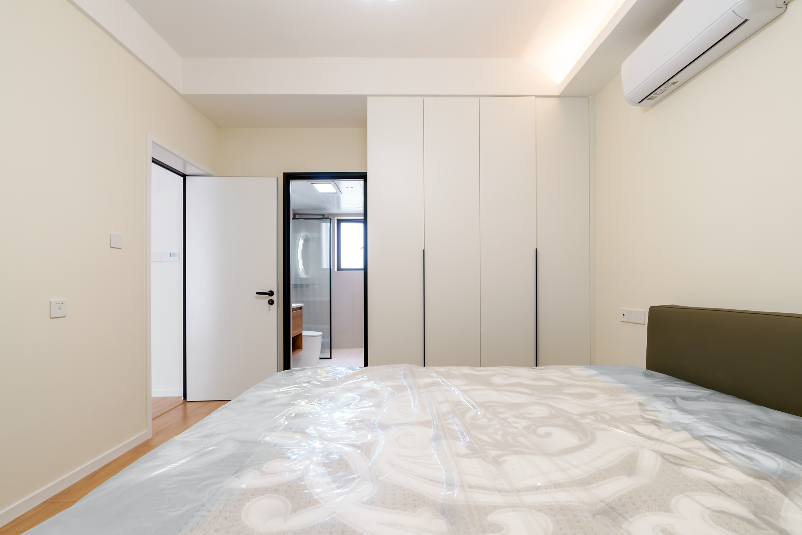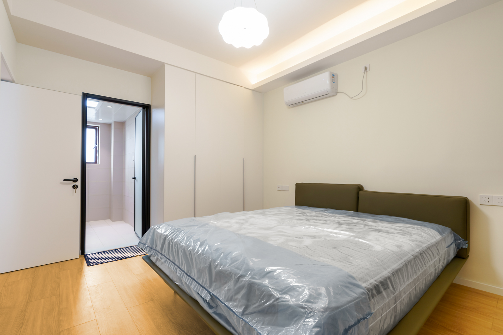 主臥簡潔的燈飾,奶油色的墻壁,1.8米的大床配上布藝床頭,拉上窗簾就營造了夢境的氛圍。一門到頂?shù)囊鹿?,再多儲物不在話下,壁掛式空調(diào)也能讓你感覺四季如春。進入每一個夜晚的夢里撫慰一天的勞累,去在每一個夜晚里細數(shù)著白天的愛意與點滴。