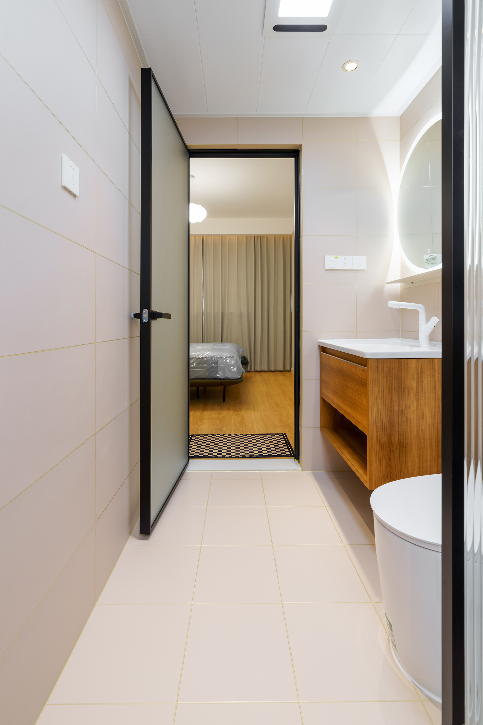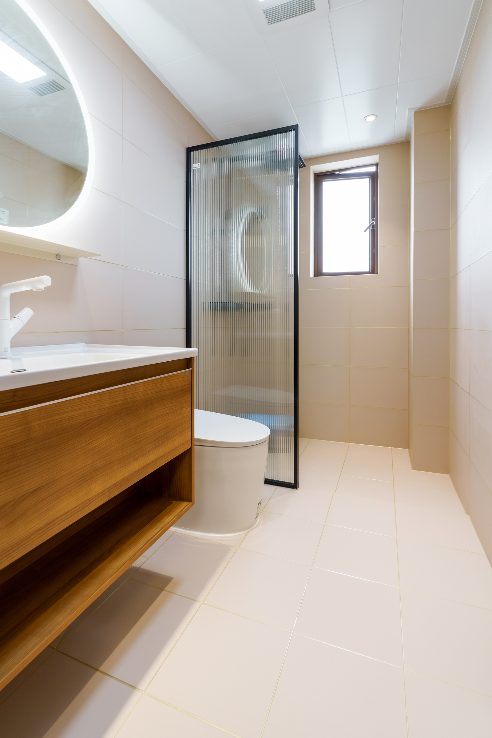 客廳的公共衛(wèi)生間,采用較前衛(wèi)的玻璃磚隔斷,保證采光也不影響衛(wèi)生間的私密性,把一切繁雜關(guān)在了衛(wèi)生間內(nèi)。里面的洗手臺和蹲便池,做到了干濕分離。洗手臺下方,鋪就一張素雅的圓形地毯,使得衛(wèi)生間也有著不俗的格調(diào)。
