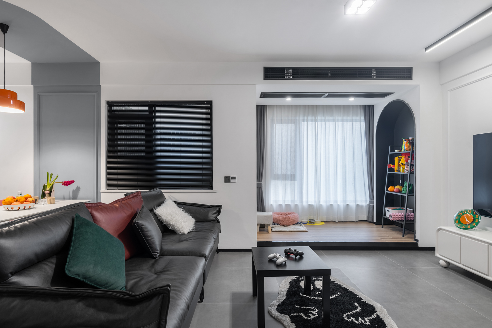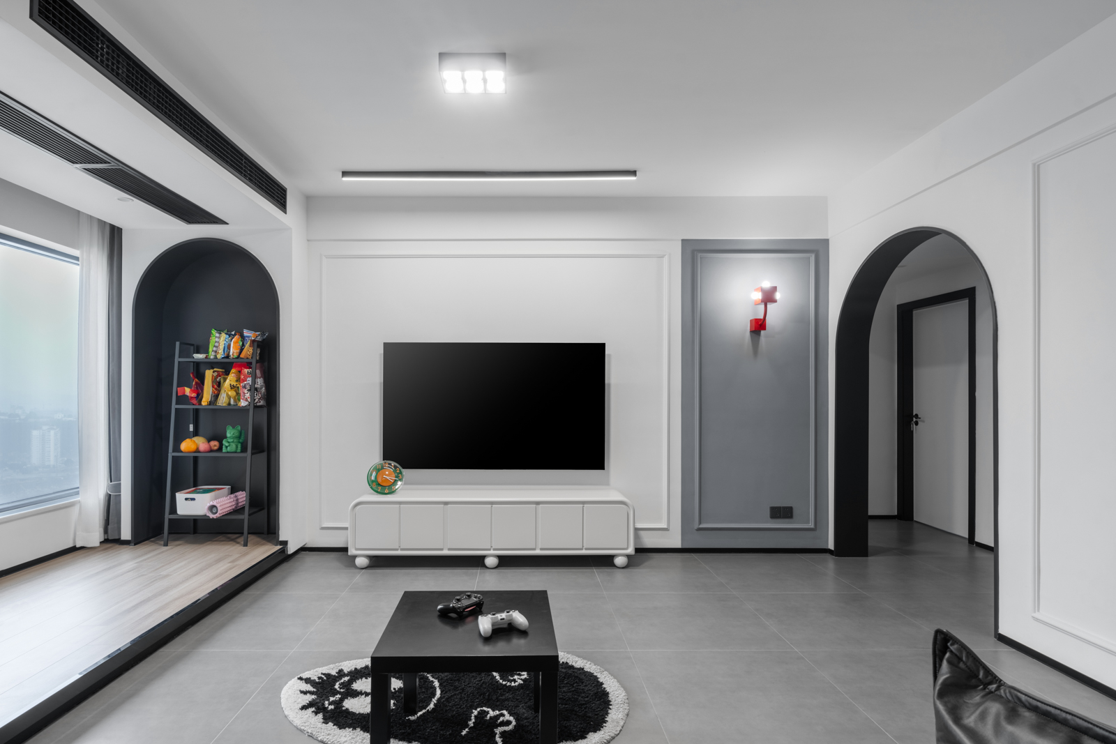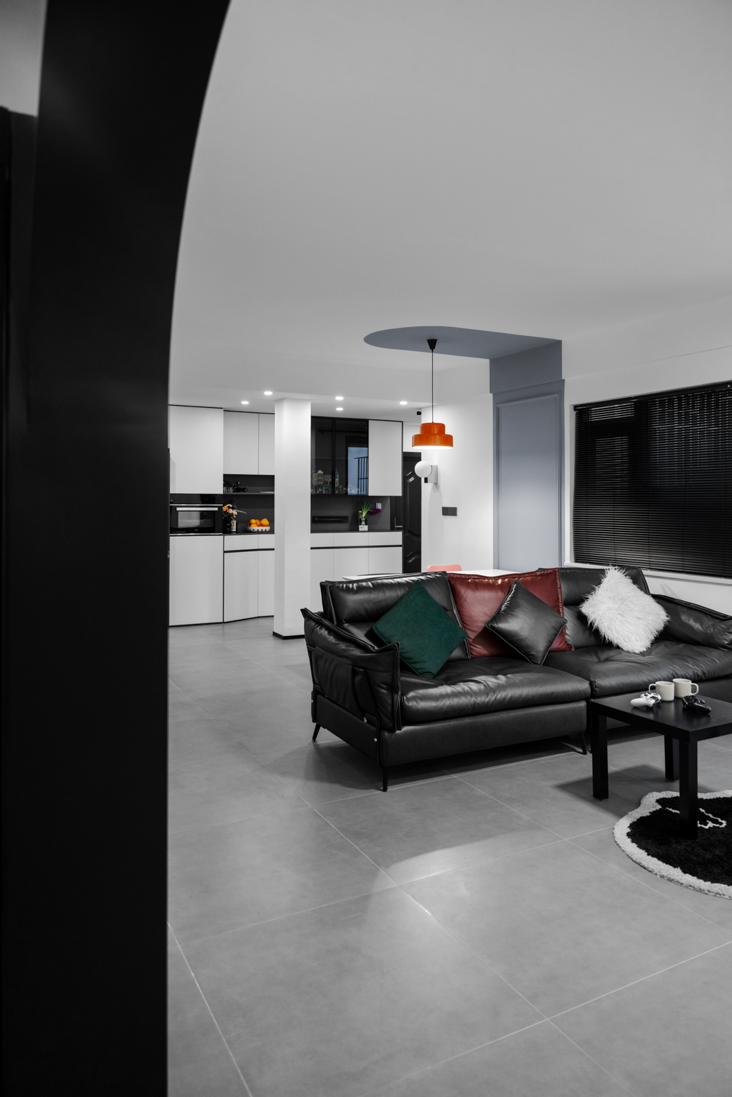 客廳采用男主喜愛的黑白再用灰色啞光質(zhì)感地磚中和。