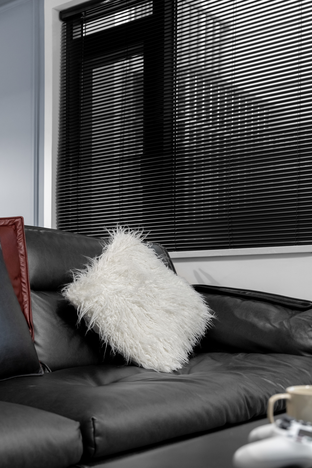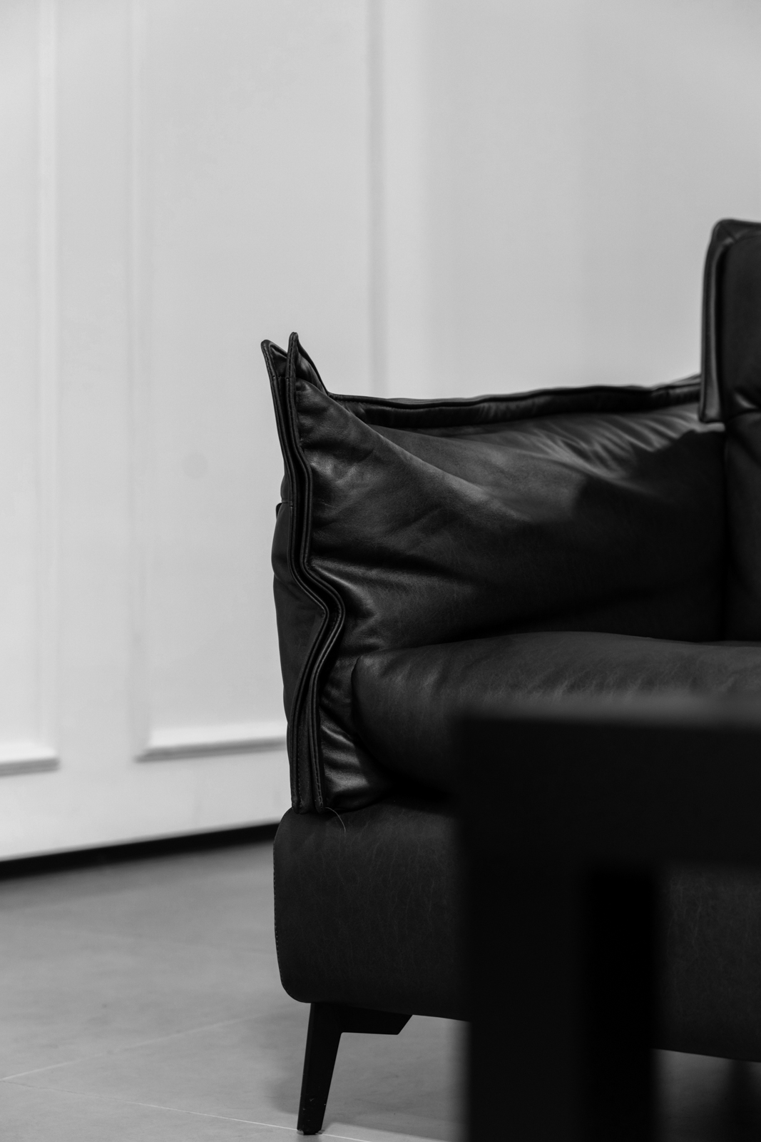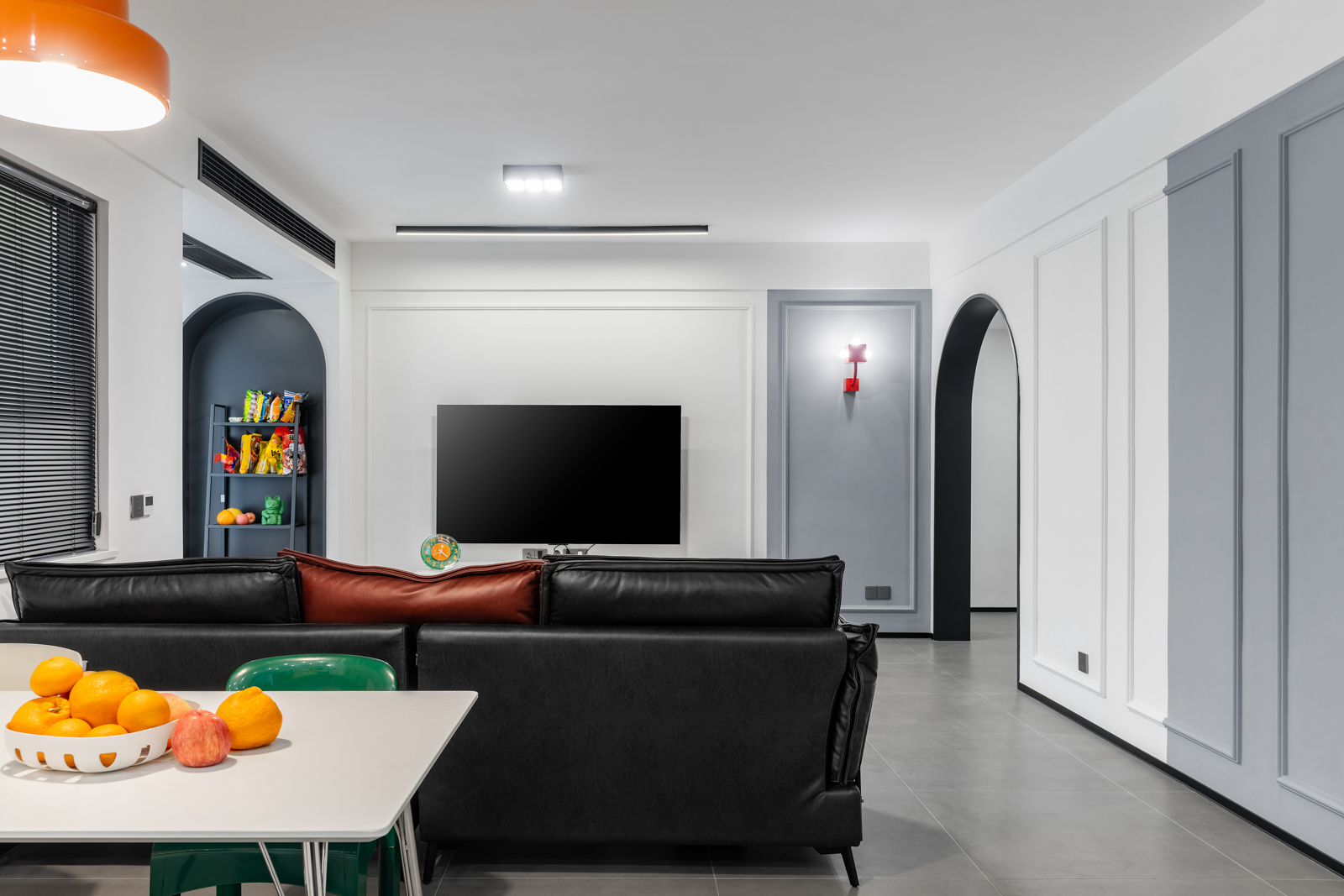 客廳采用男主喜愛的黑白再用灰色啞光質(zhì)感地磚中和。