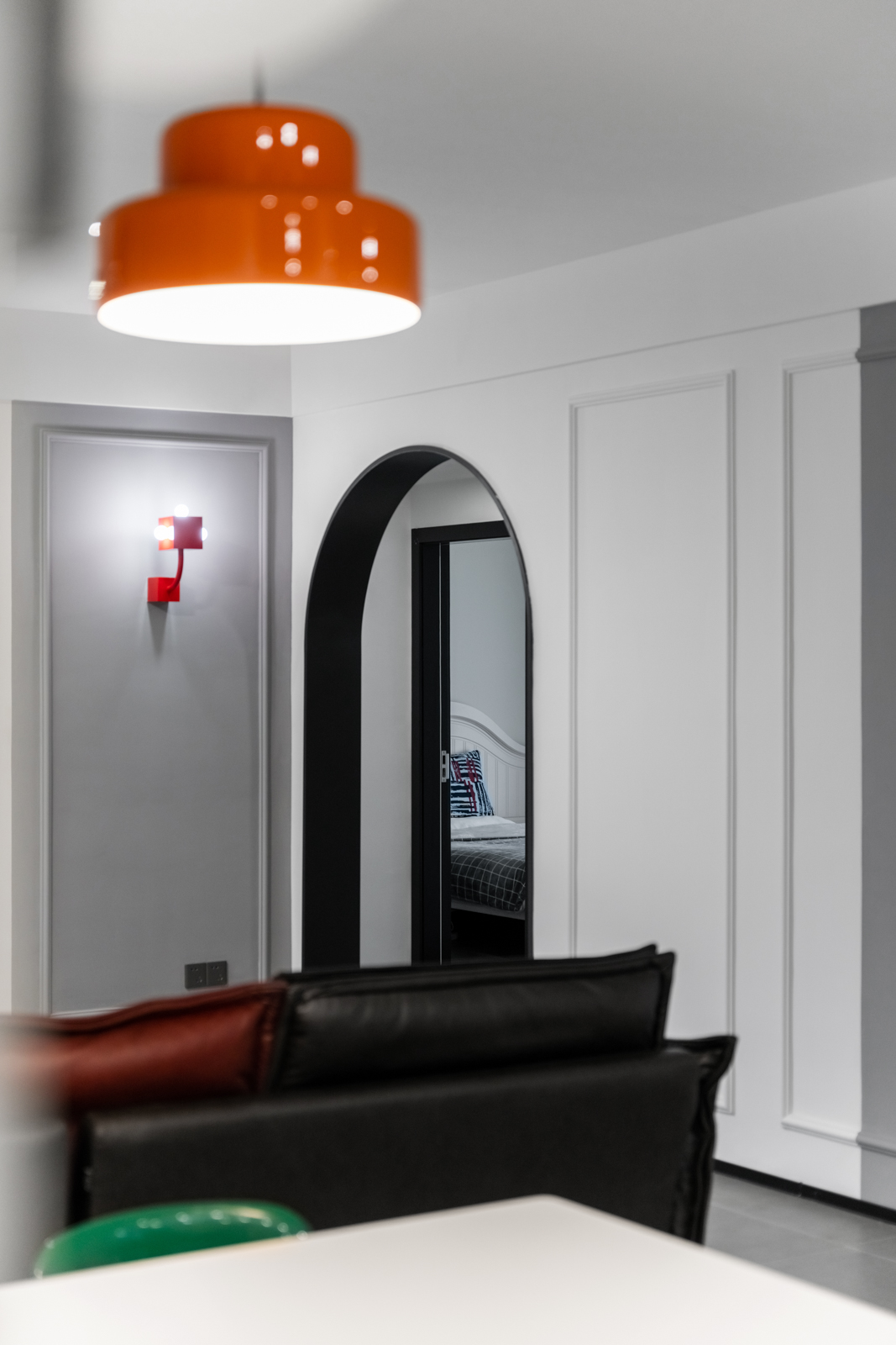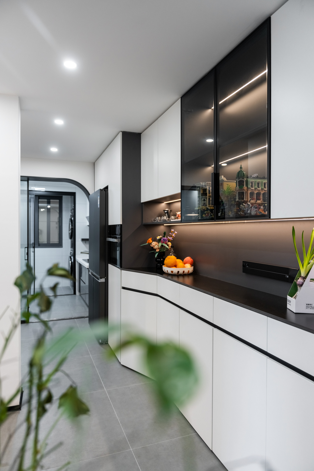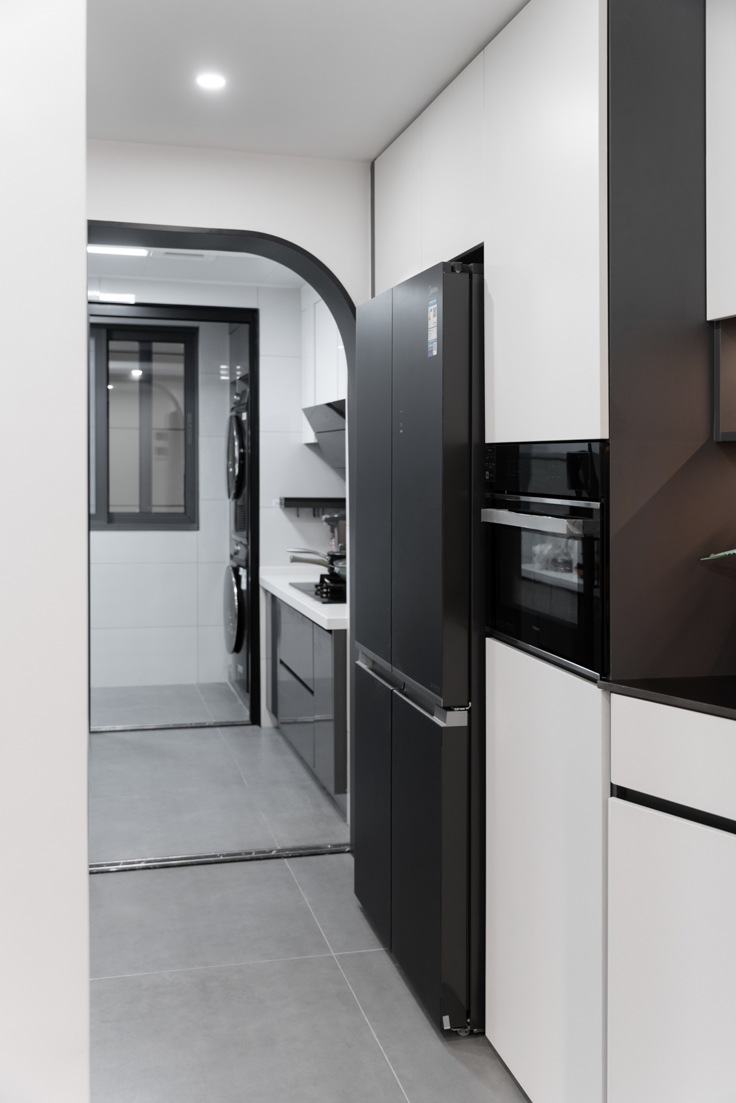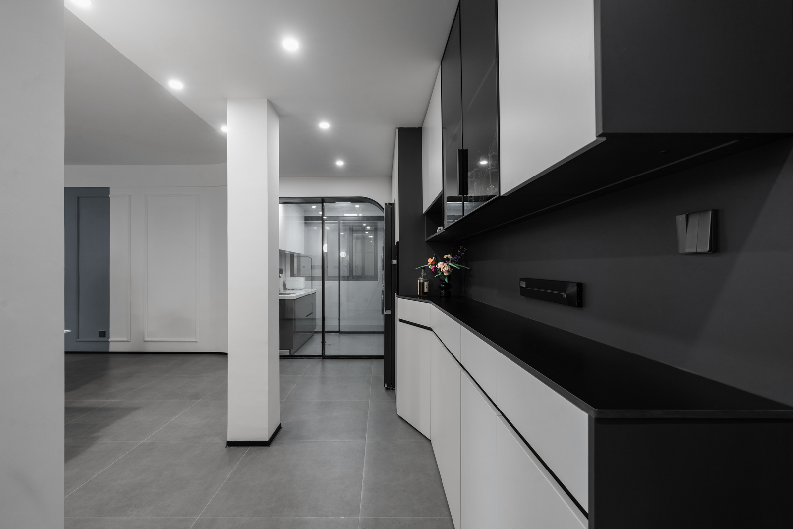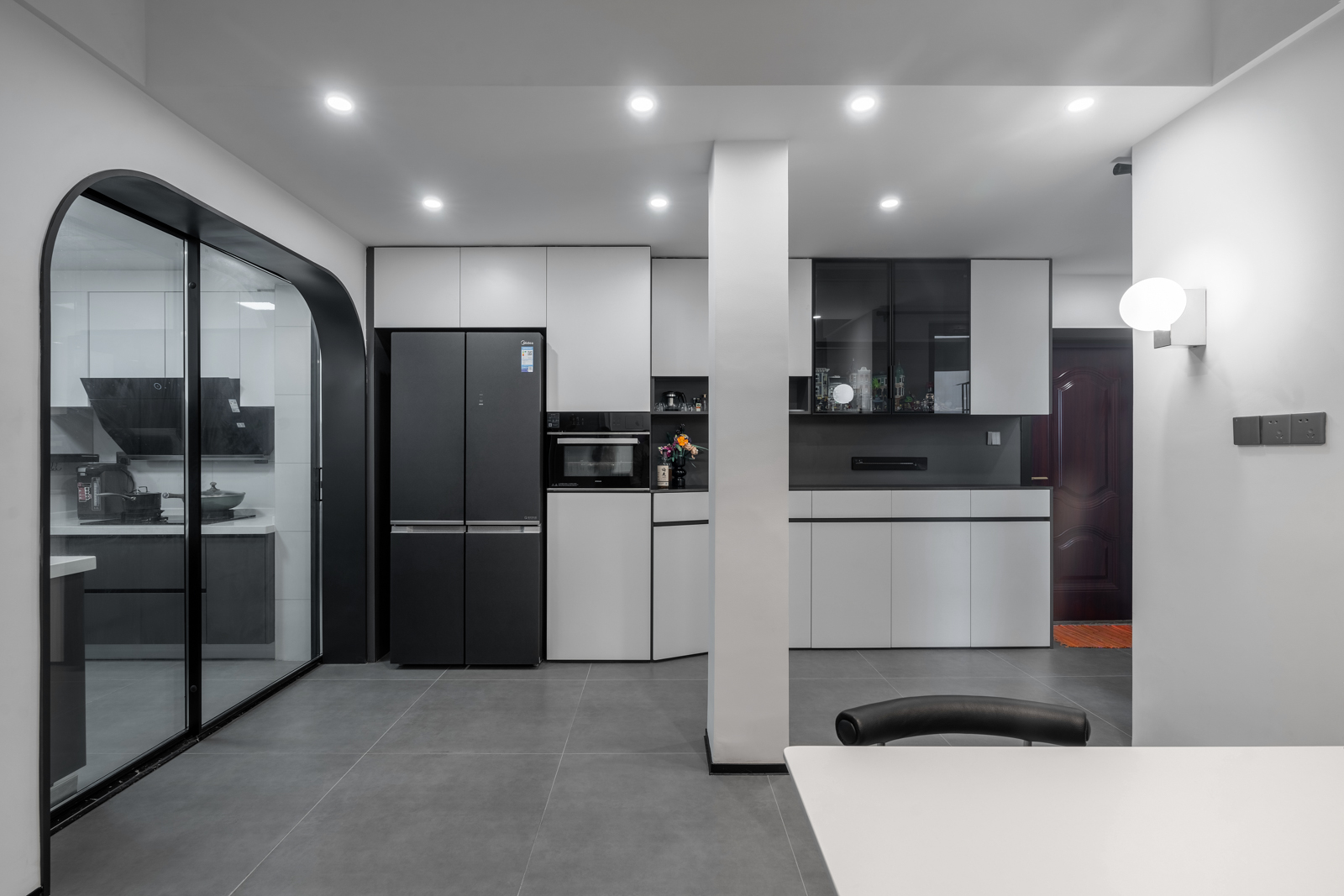 直入眼簾的是黑色拱形+推拉玻璃門。