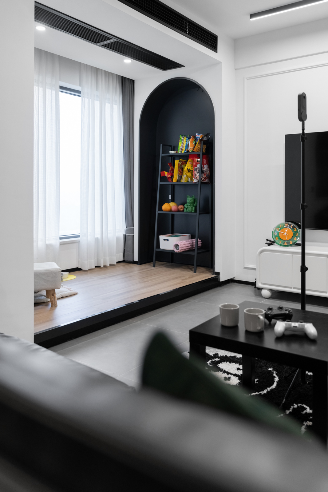 把休閑陽臺抬高并在一側(cè)打造了屋主喜愛的拱形門洞造型,同時安置了一個置物架,放置零食,打造成擼貓休閑區(qū),宅家的快樂難以表達,有它都不想出門!