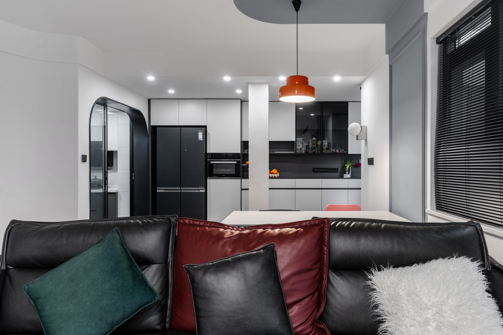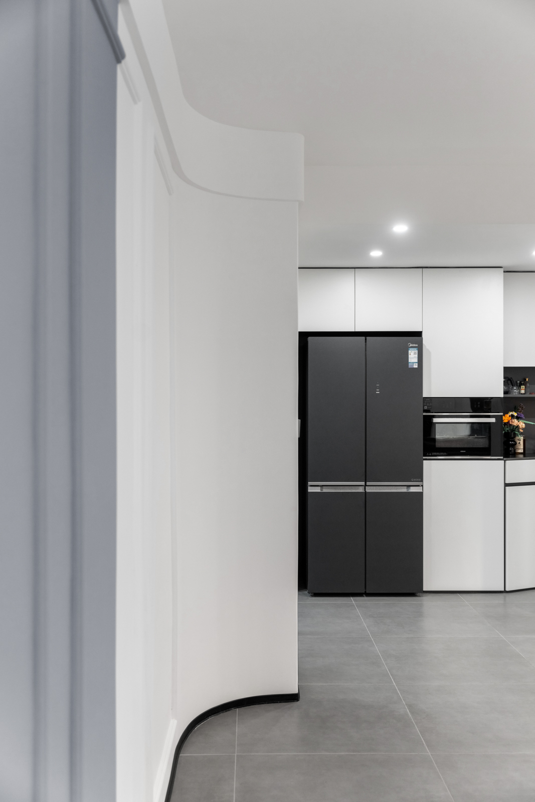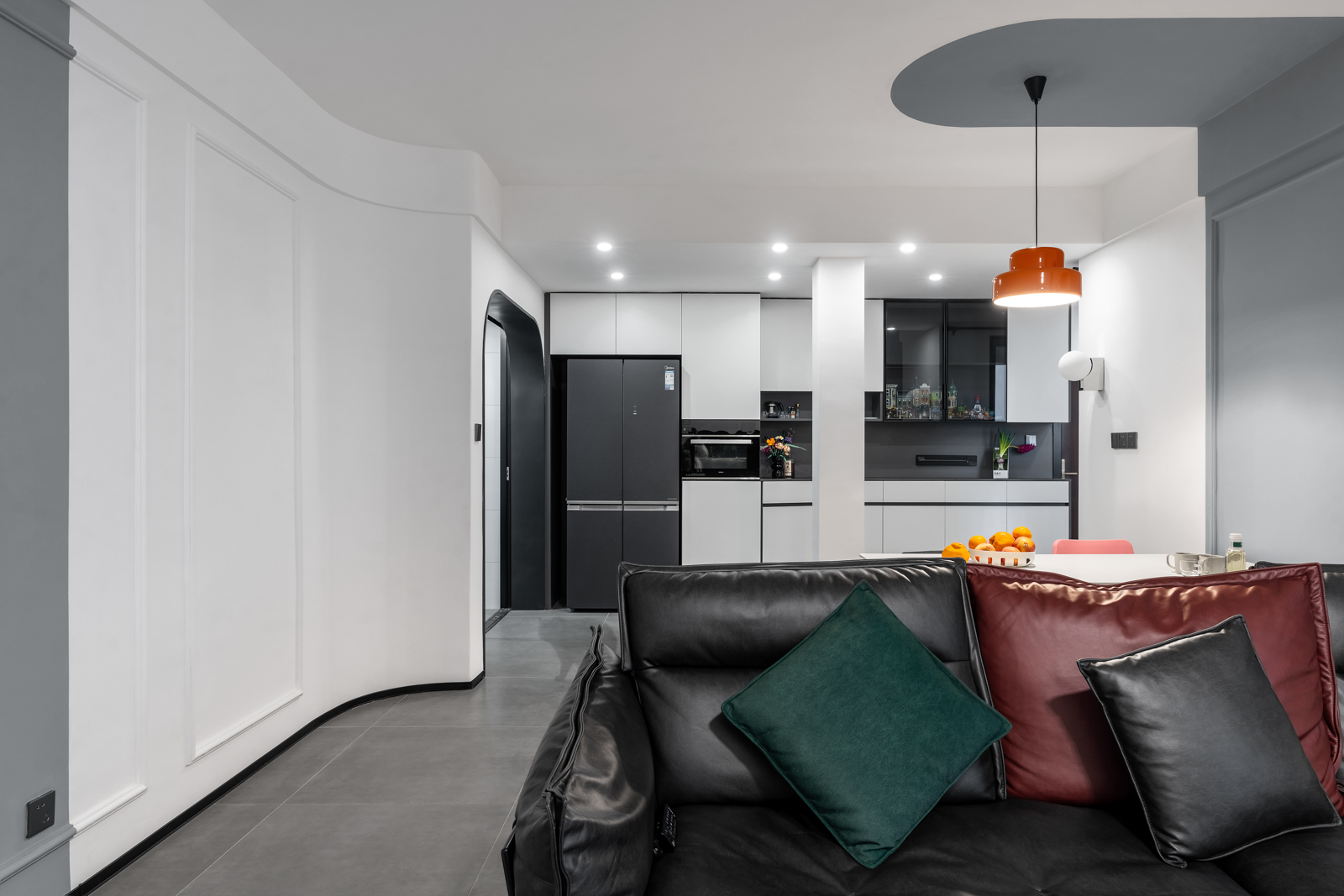 廚房與客廳的界限,將陰角做出弧形造型,使得廚房突出部分過渡更自然。