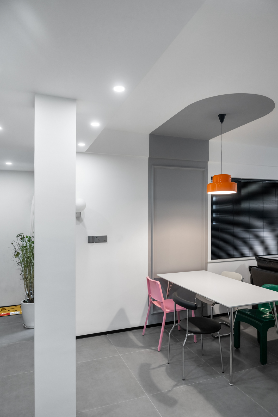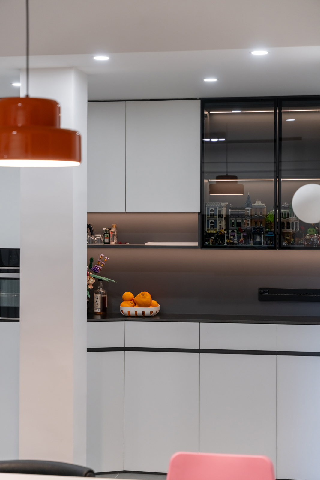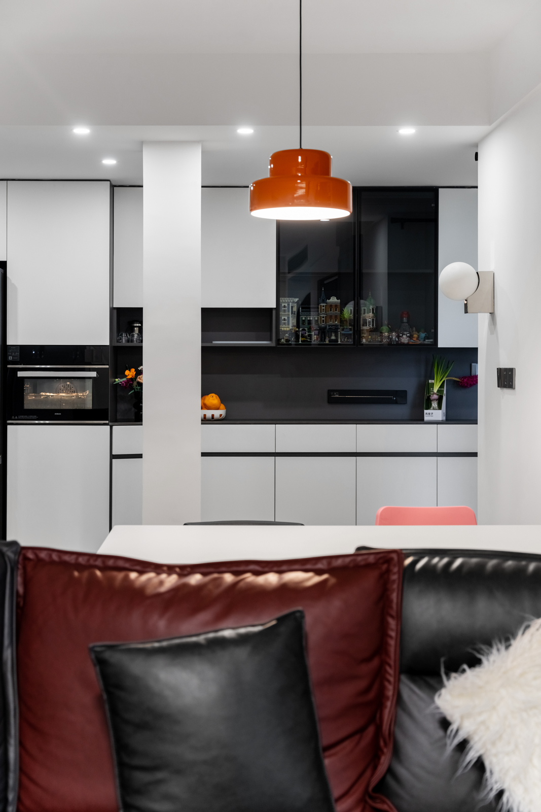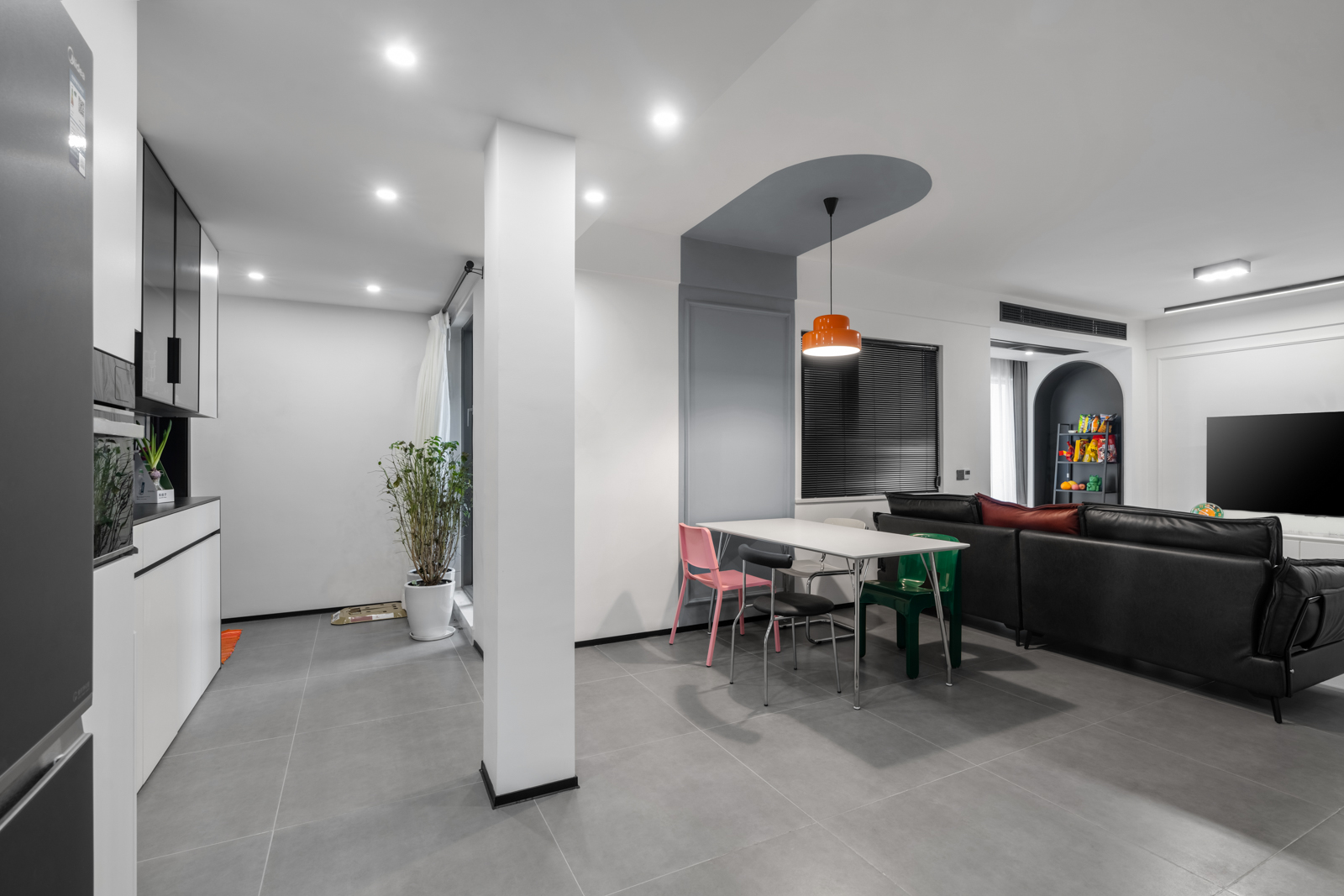 廚房與客廳的界限,將陰角做出弧形造型,使得廚房突出部分過渡更自然。