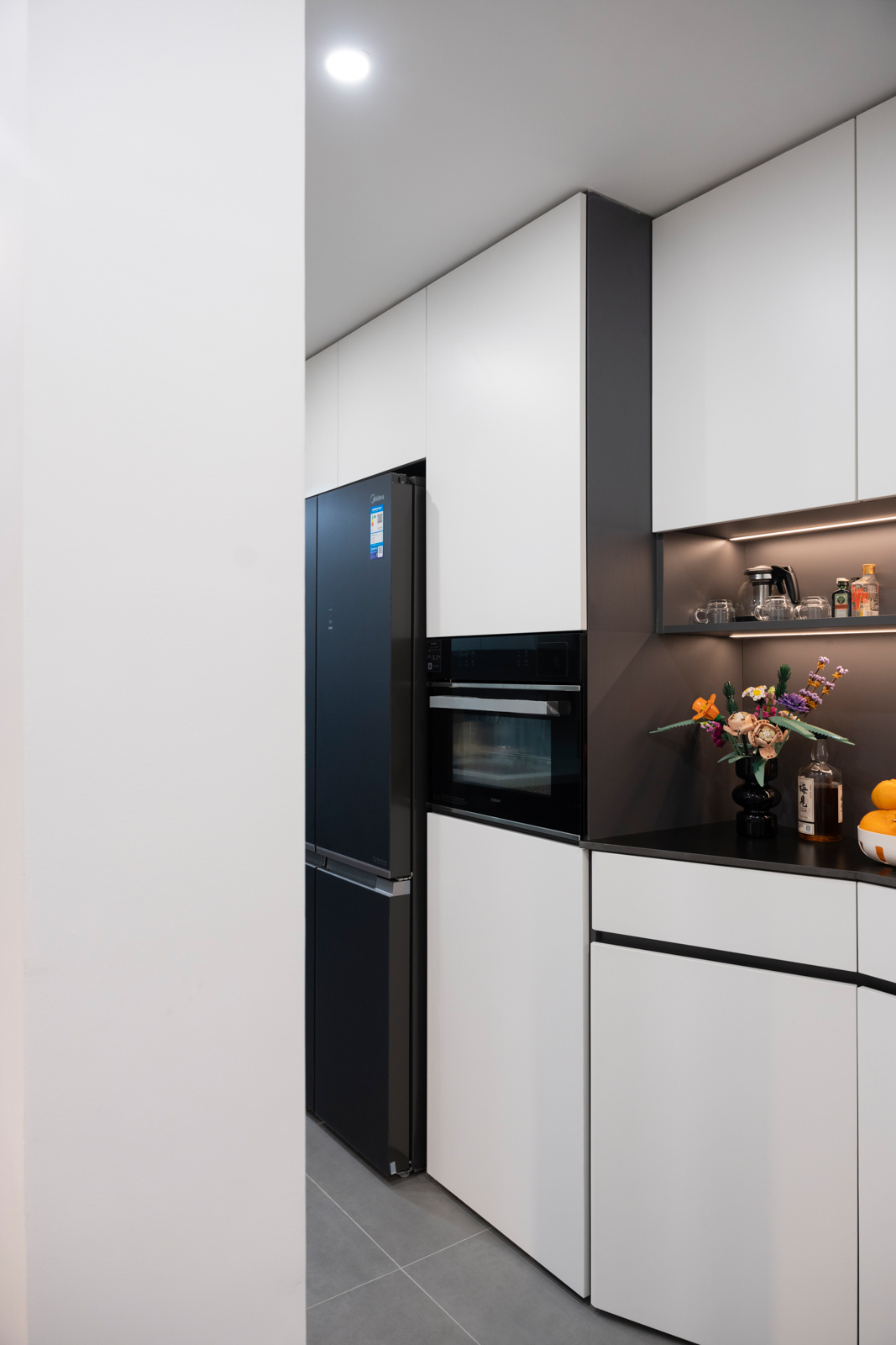 將入戶鞋柜、儲物柜、餐邊柜集一體,再將冰箱做“嵌入式”設(shè)計,既能解決冰箱無處安放的尷尬場景,又能保證功能需求和儲物。