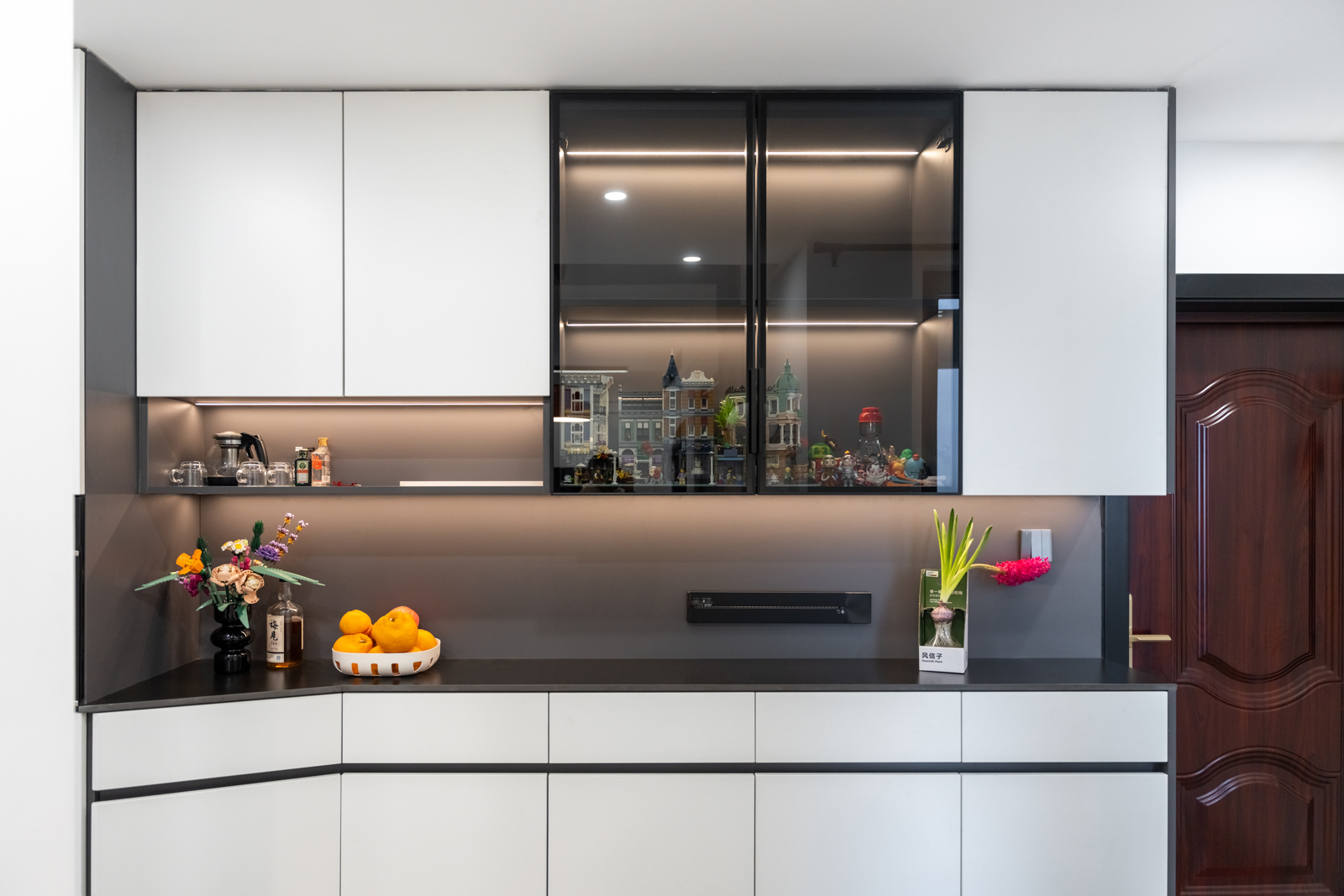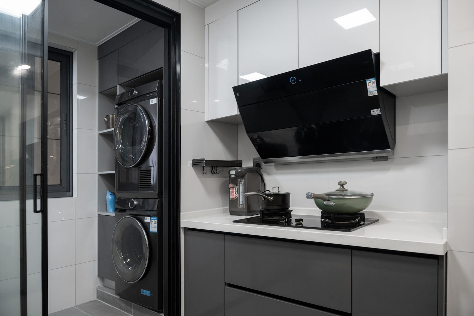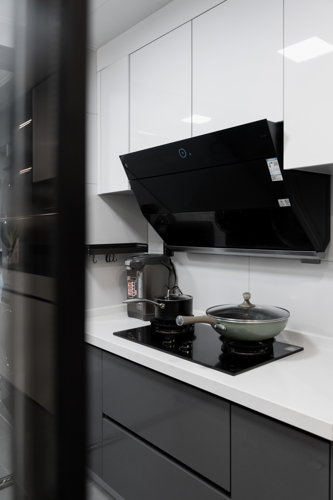 廚房里面采取黑色櫥柜+白色臺面,復(fù)古的氛圍散發(fā)在每一份煙火氣中。